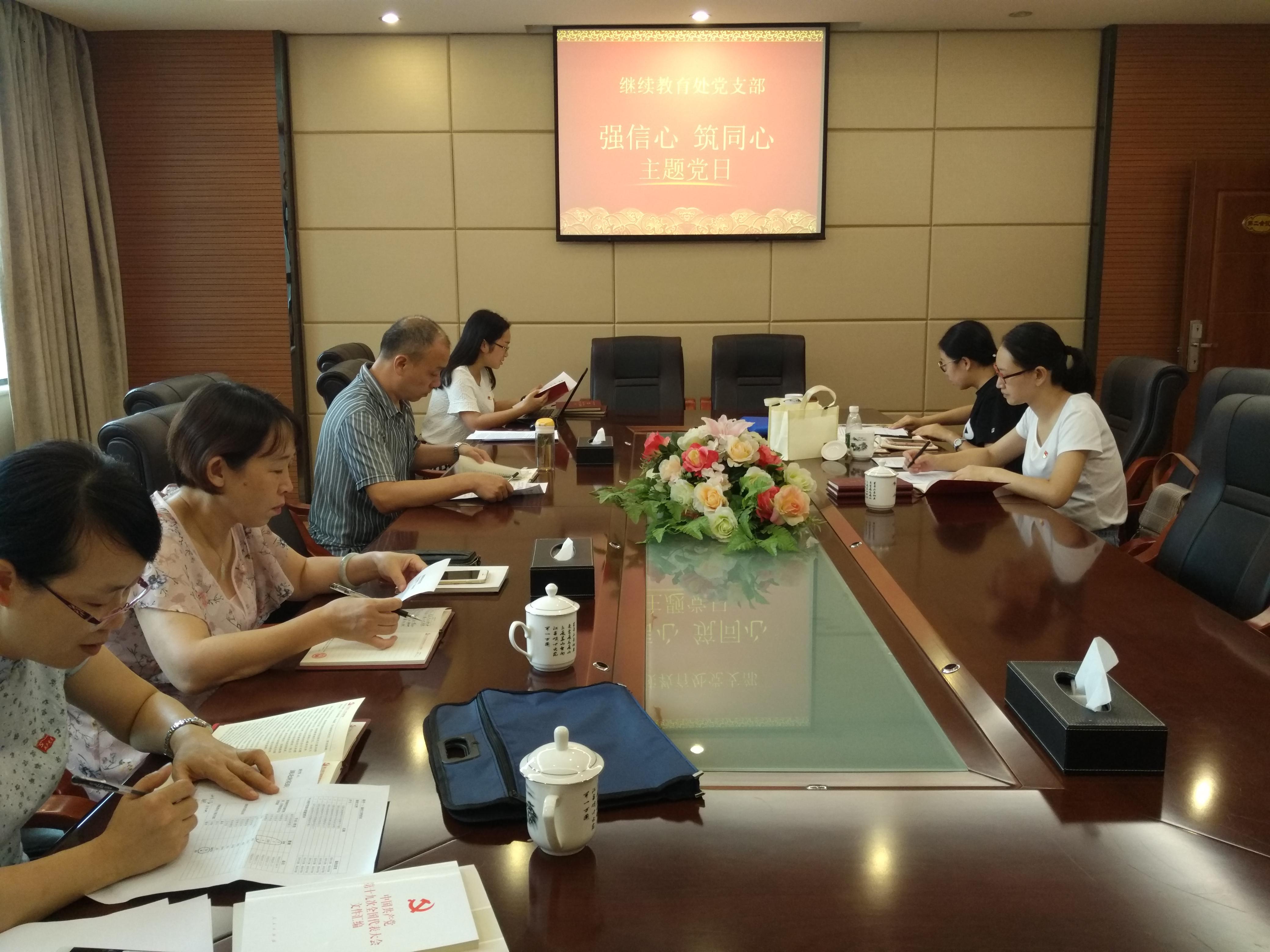 2018年8月31日,继续教育党支部在学院干训大楼三楼第二会议室,召开了支部主题党日活动。活动主题是“强信心,筑同心”。会议由支部组织委员罗旋主持,支部全体党员参加会议。