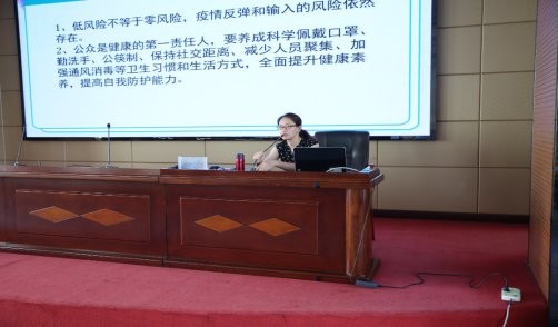 为认真贯彻落实《省教育厅 省卫生健康委关于印发〈湖北省学校新冠肺炎疫情防控技术指导方案〉的通知》和《湖北财税职业学院新冠肺炎疫情防控期间开学工作方案》的精神,进一步做好全面战胜新冠肺炎疫情、强化爱国卫生运动等有关工作,6月15日下午,继续教育处在干训楼15楼举行了一场新冠肺炎防疫知识讲座,干部培训处全体人员和干训楼工作人员参加了讲座,继续教育处处长王晓春主持了讲座。