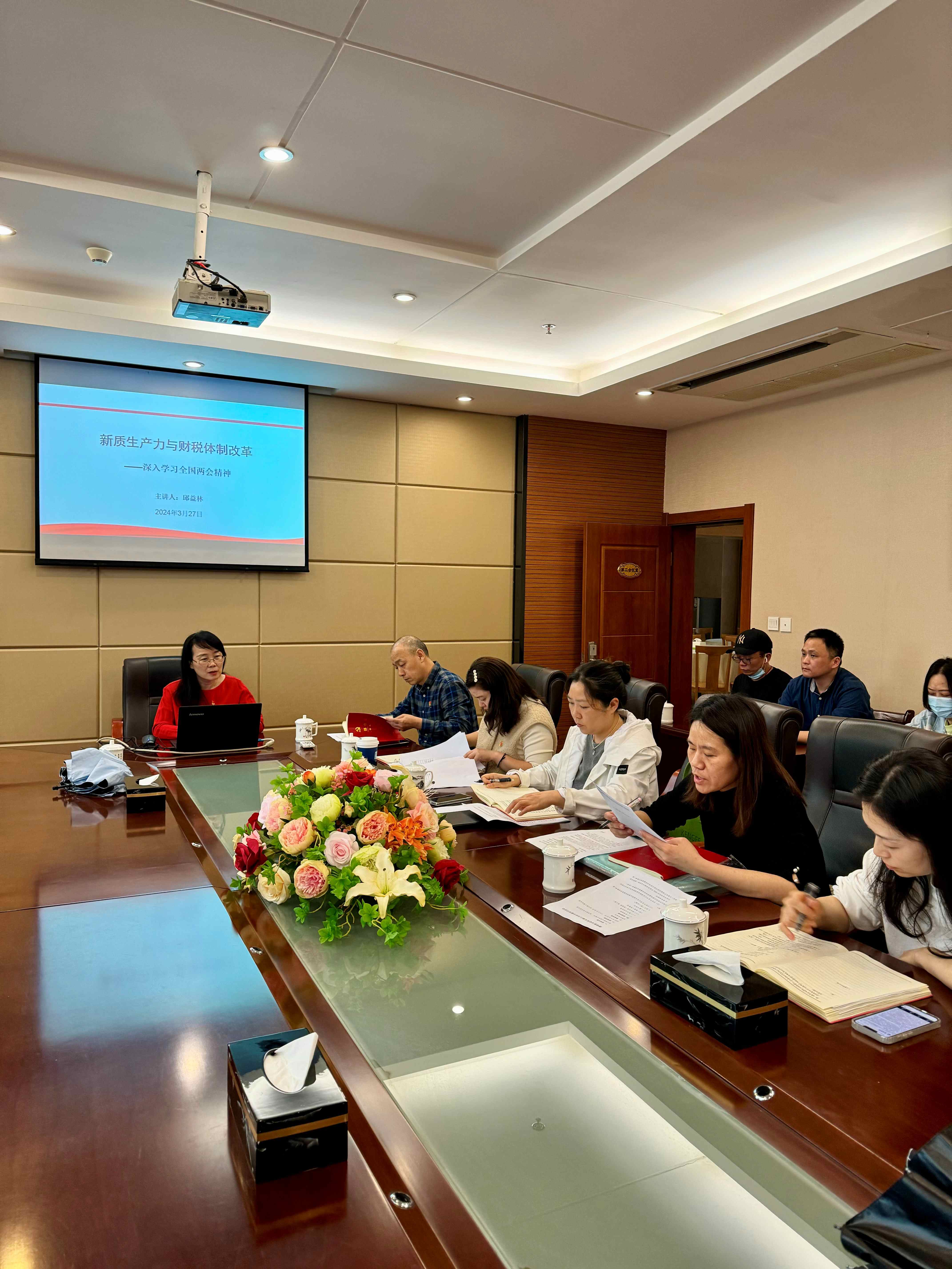 2024年3月27日下午,继续教育处党支部在干训楼3楼会议室召开了支部主题党日活动,本次活动主题为“学习贯彻全国两会精神 教育服务高质量发展”,支部书记主持,继续教育处党支部党员及部门非党员均参加活动。