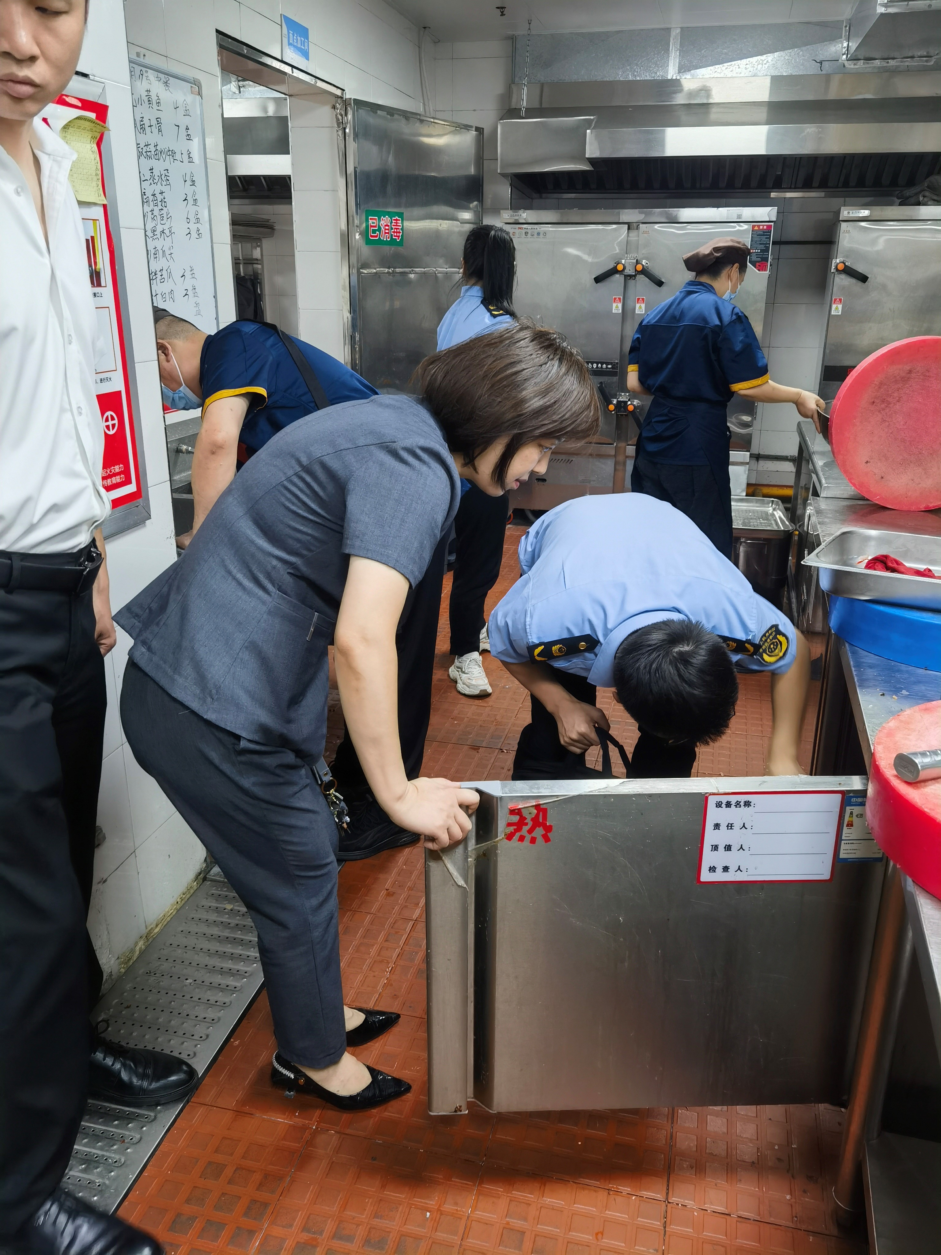 2024年9月11日上午10时,武汉市武昌区市场监督管理局白沙洲监督所队长朱家靖、队长金香一行到学校干训楼厨房进行食品安全检查工作。